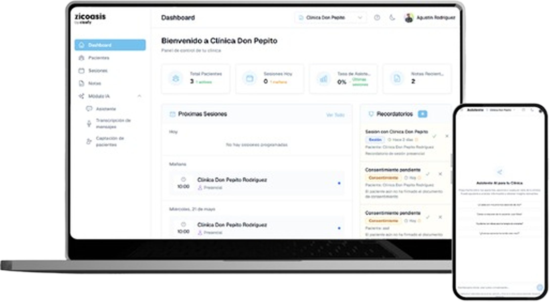Con Zicofy CRM (ex ZicoAsis), podrás gestionar tu consulta de forma integral: desde la agenda hasta las tareas terapéuticas, pasando por notas clínicas, facturación y un automatizaciones con IA.